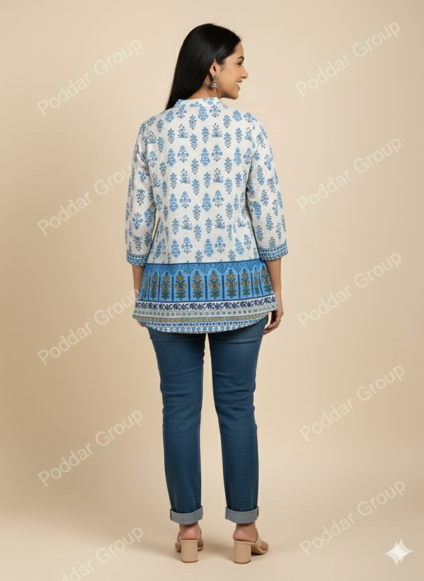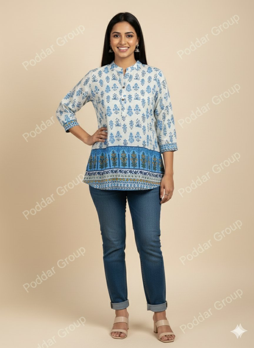 Style and Look: This is an elegant, straight-cut tunic top (or short kurta) with a classic ethnic/Indian wear aesthetic. Its design is heavily inspired by traditional Mughal or Rajasthani block printing. It has a neat, tailored fit and a modest length, making it ideal for casual office wear, college, or day-time outings.