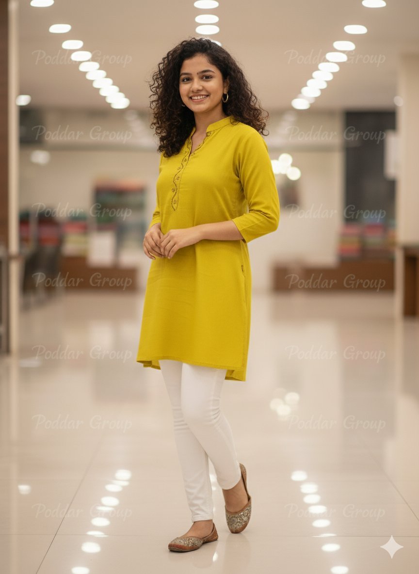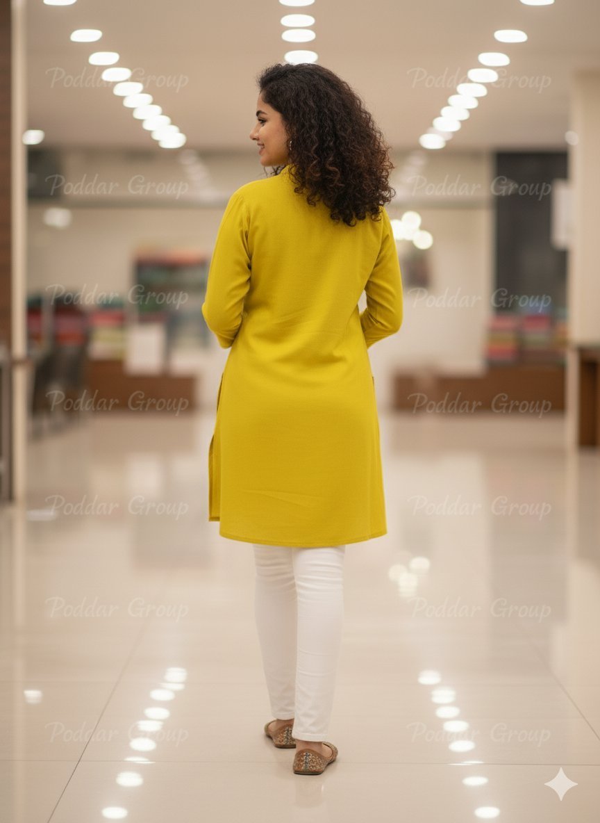 A beautifully vibrant yellow-green kurti with a polished finish. This tunic features a banded, or stand, collar and a modest V-cut neckline. The front is subtly embellished with a vertical line of intricate beadwork or embroidery along the placket, adding a touch of elegance. The body of the top showcases a textured fabric, possibly khadi or slub cotton, giving it a rich feel. With full-length sleeves and a comfortable length, it’s perfect for casual office wear, daily outings, or pairing with white palazzo pants or churidars.
