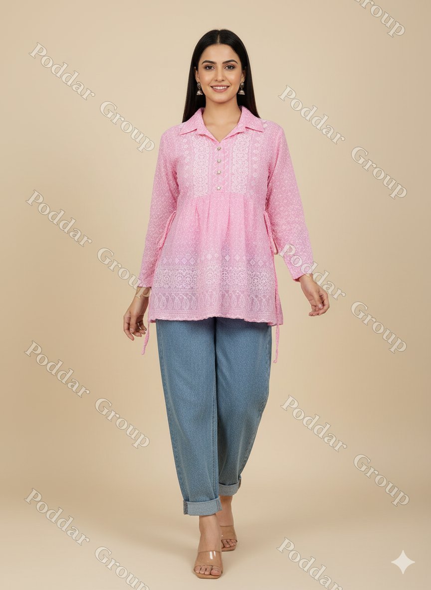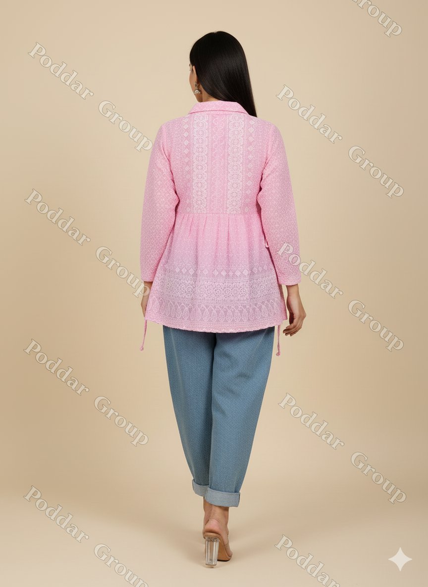 This lovely top features a vibrant baby pink color with intricate white embroidery throughout, resembling traditional Indian Chikankari work. It’s a perfect blend of ethnic charm and modern silhouette.