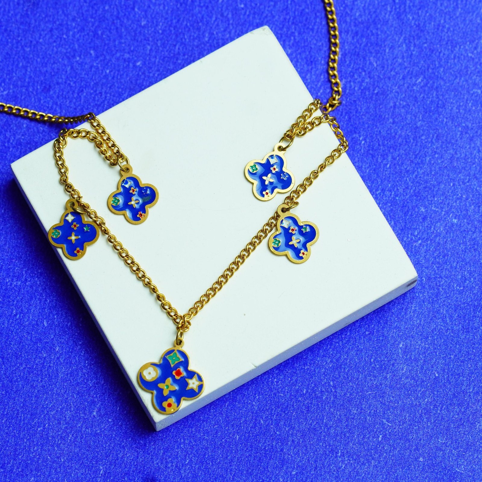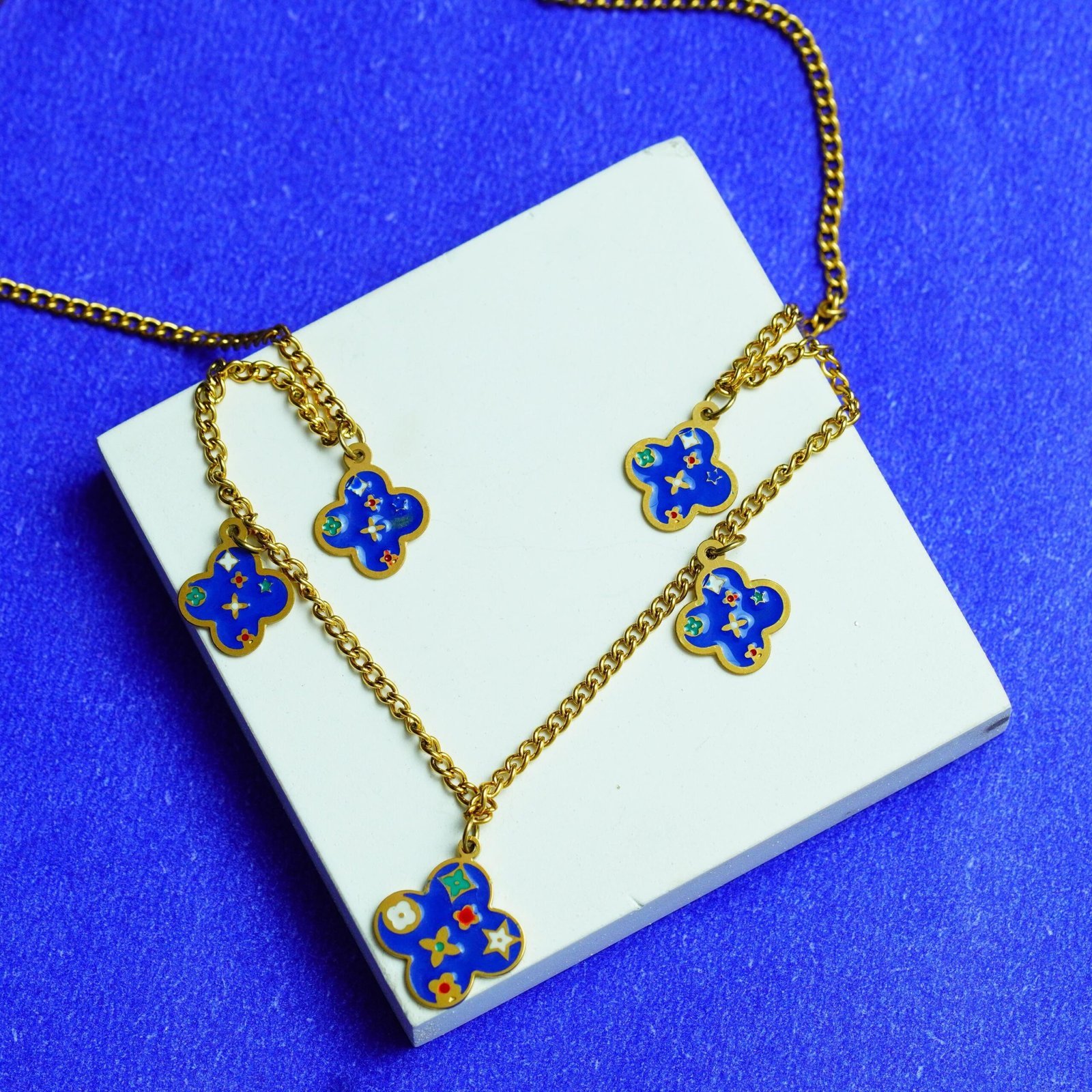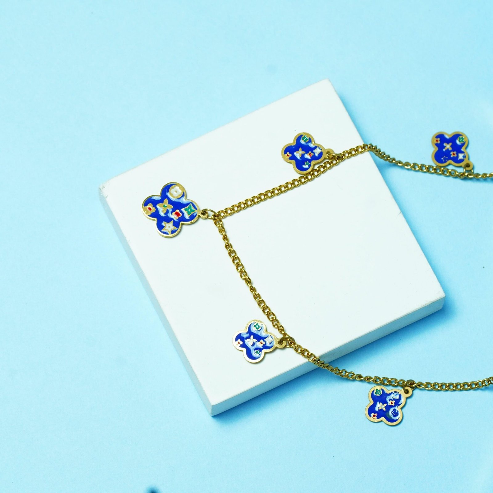 Add a touch of elegance to your style with this Gold-Plated Blue Enamel Clover Charm Necklace. Designed with delicate clover-shaped pendants in vibrant blue enamel, this necklace beautifully blends modern charm with timeless sophistication. Perfect for both casual outings and special occasions, it makes a versatile addition to your jewelry collection. Lightweight, durable, and stylish – this piece is a must-have accessory to elevate your look.