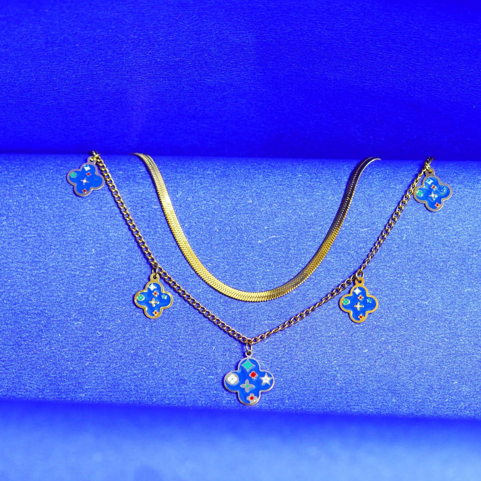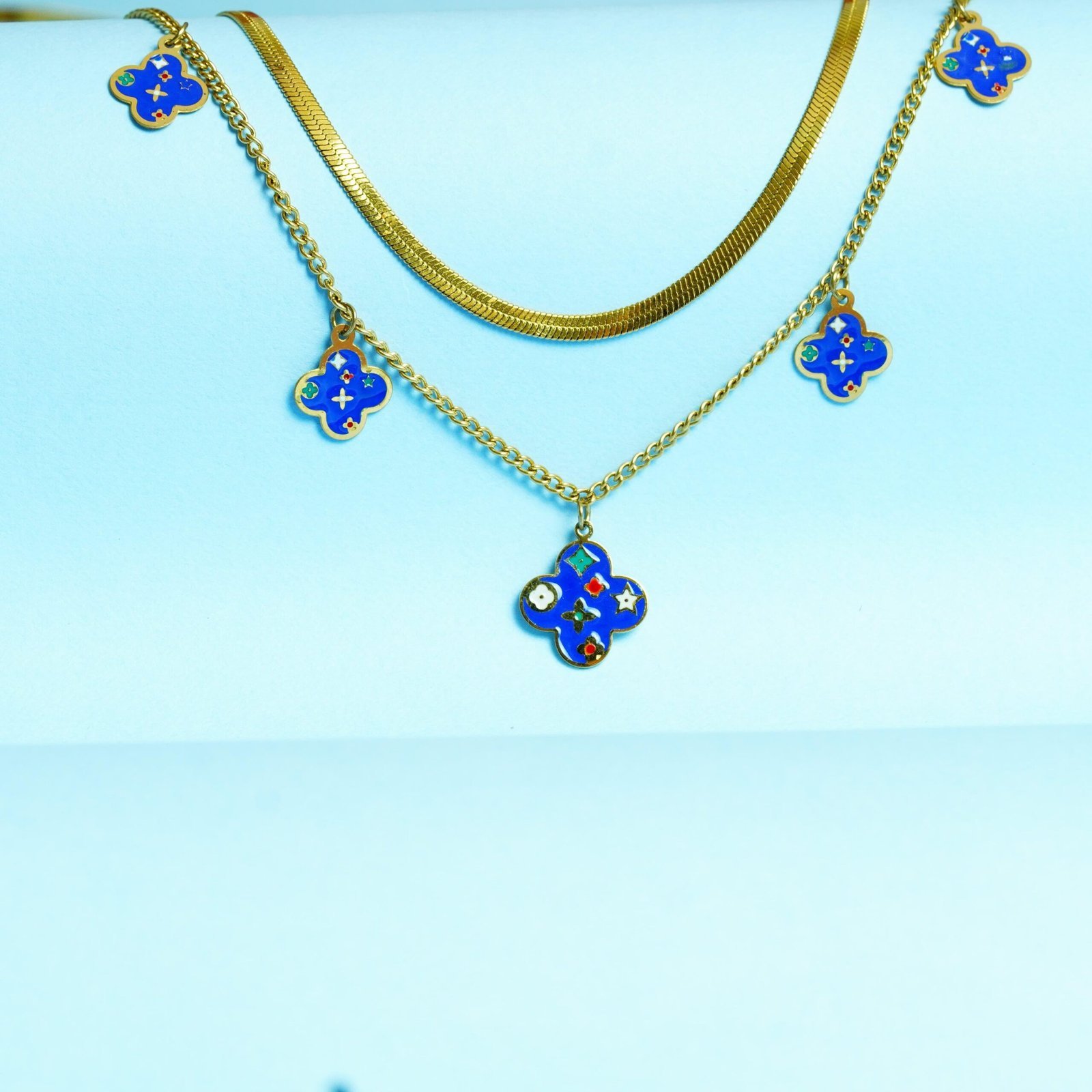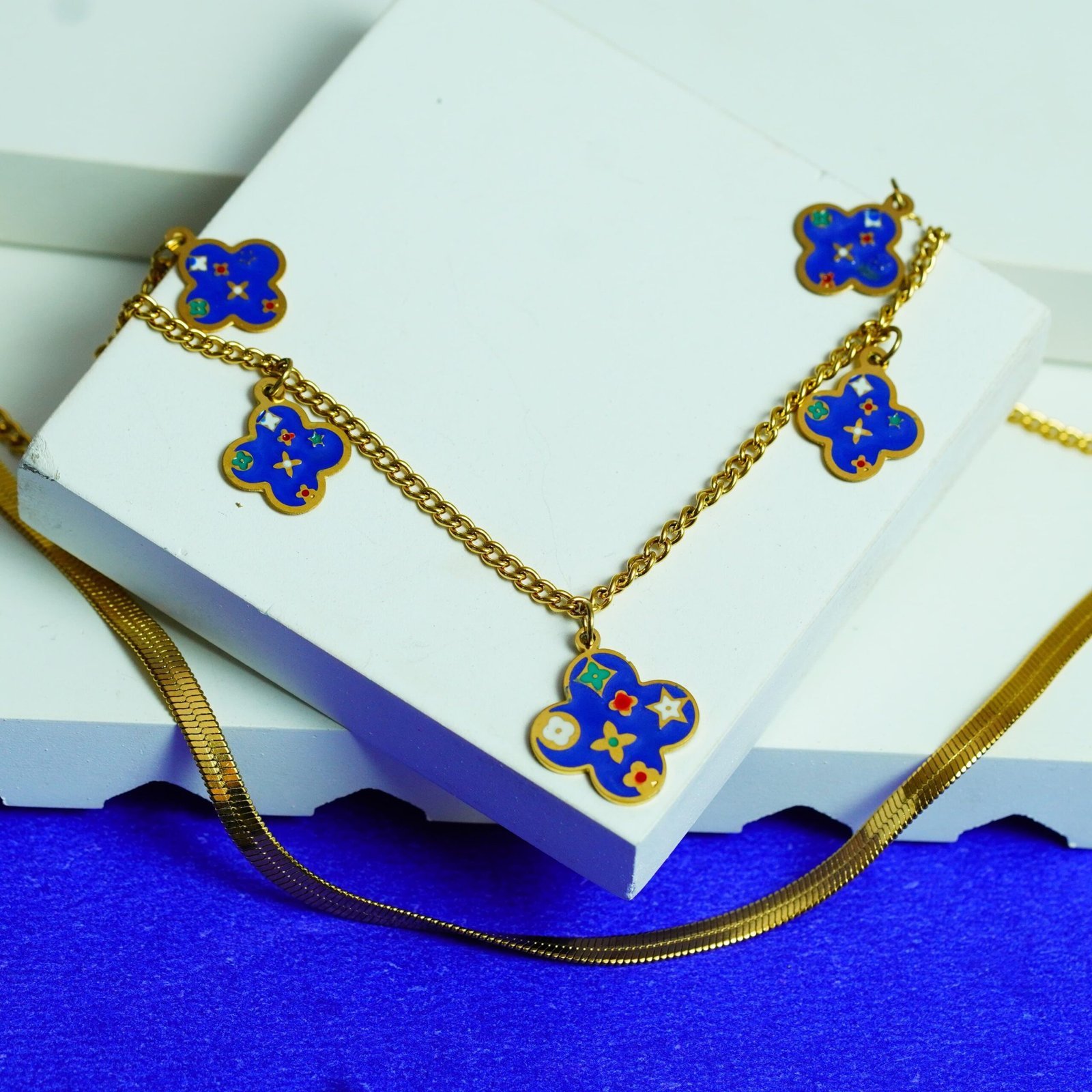 Add a touch of elegance to your style with this Gold-Plated Blue Enamel Clover Charm Necklace. Designed with delicate clover-shaped pendants in vibrant blue enamel, this necklace beautifully blends modern charm with timeless sophistication. Perfect for both casual outings and special occasions, it makes a versatile addition to your jewelry collection. Lightweight, durable, and stylish – this piece is a must-have accessory to elevate your look.