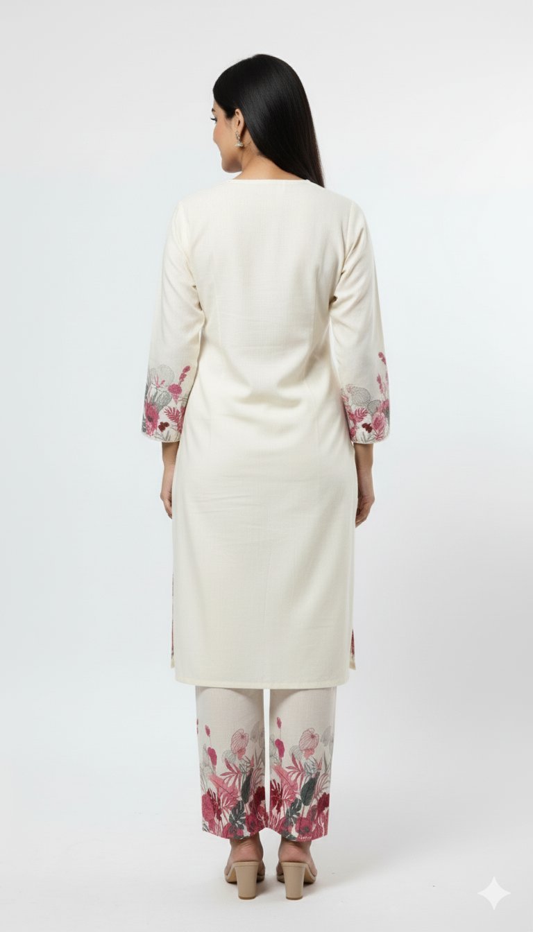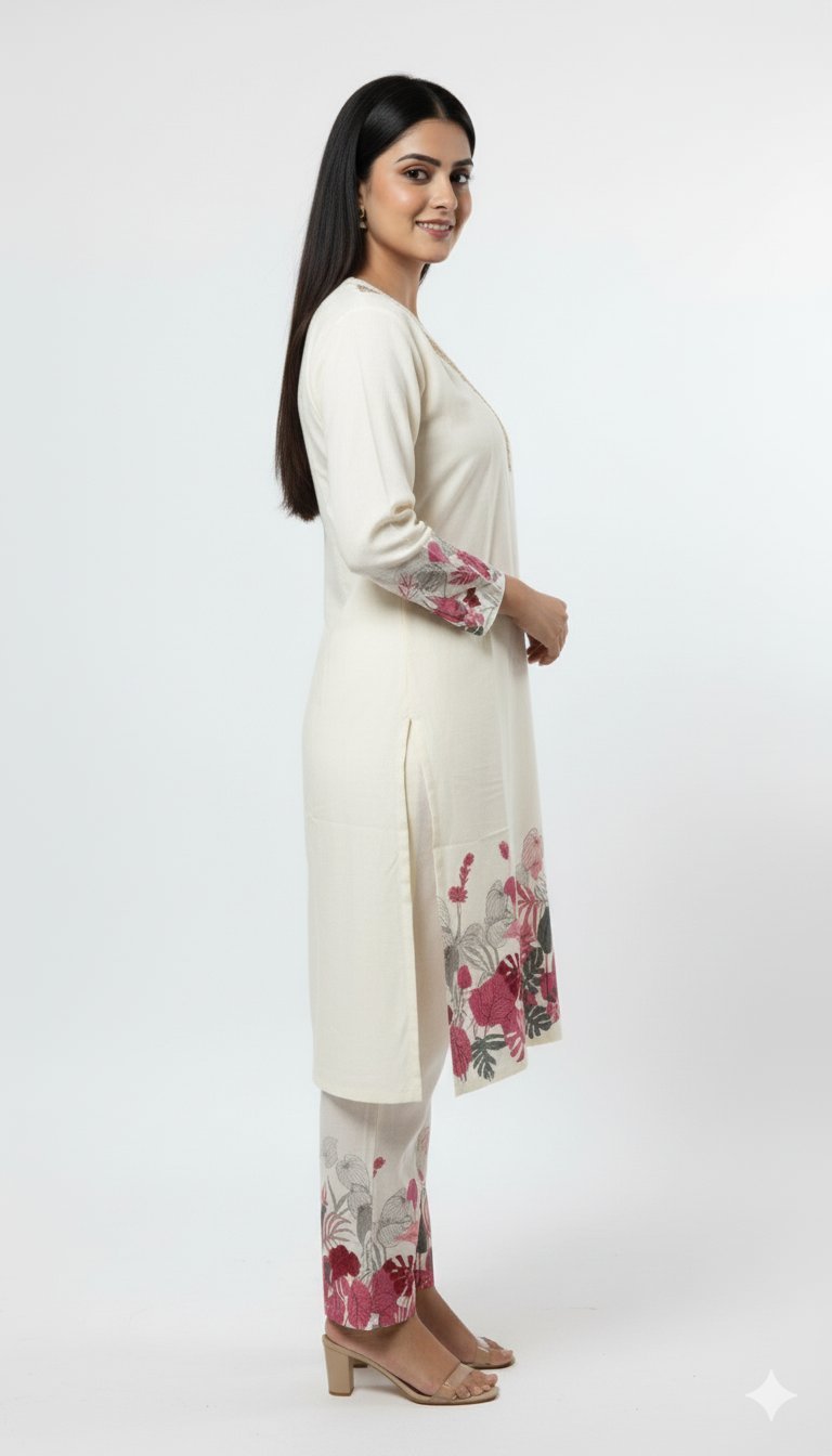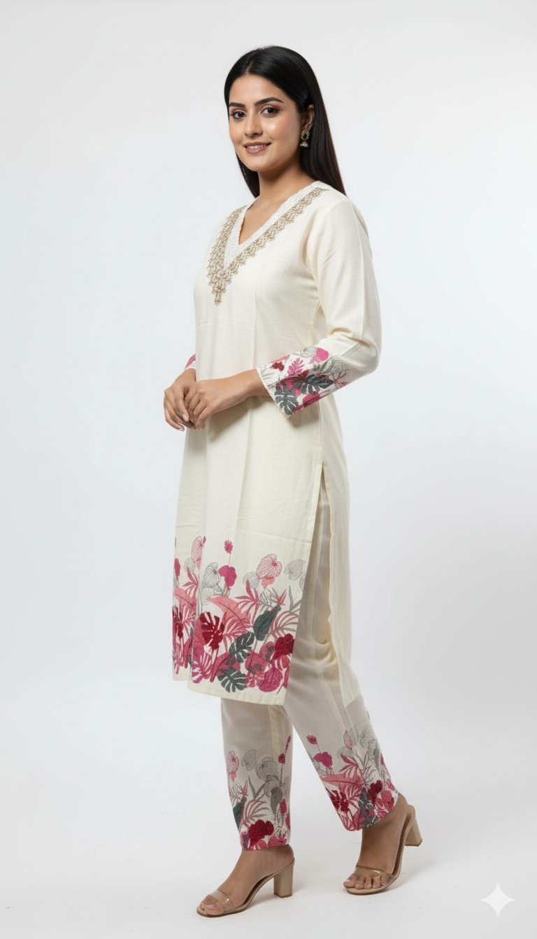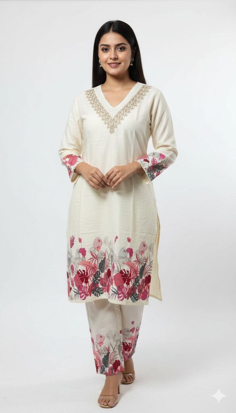 Elegant ivory kurta pant set crafted in soft cotton blend, featuring delicate lace work on the neckline and vibrant floral prints on the hemline and pants. Perfect for festive occasions, office wear, or casual gatherings.