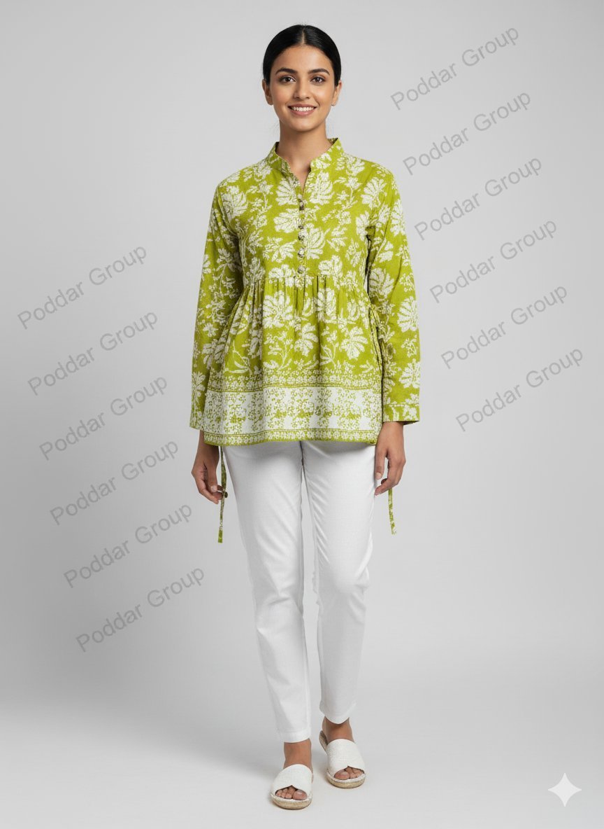 Brighten your day with this vibrant yellow-green and white top. It features an all-over botanical print in a cheerful, summery palette. The top is designed with a high, gathered empire waist that creates a flattering, flowy peplum silhouette. It includes a stylish stand collar that dips into a V-neck, secured by a full button placket down the front. With its full sleeves and light, breezy fabric, this top is perfect for pairing with jeans or shorts for a fun, feminine, and comfortable look.