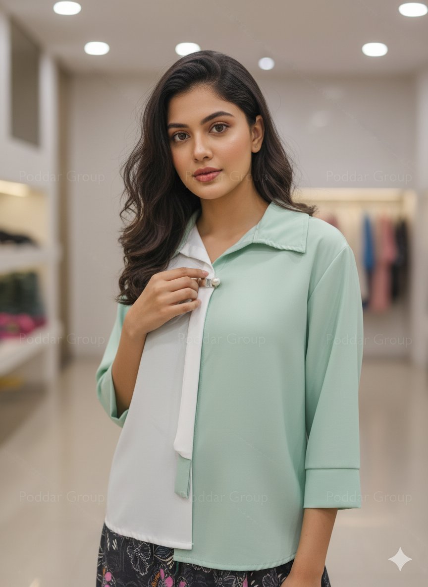 This fashionable top is perfect for a chic and modern look. It features a striking color-block design split between a soothing mint green and a crisp white.