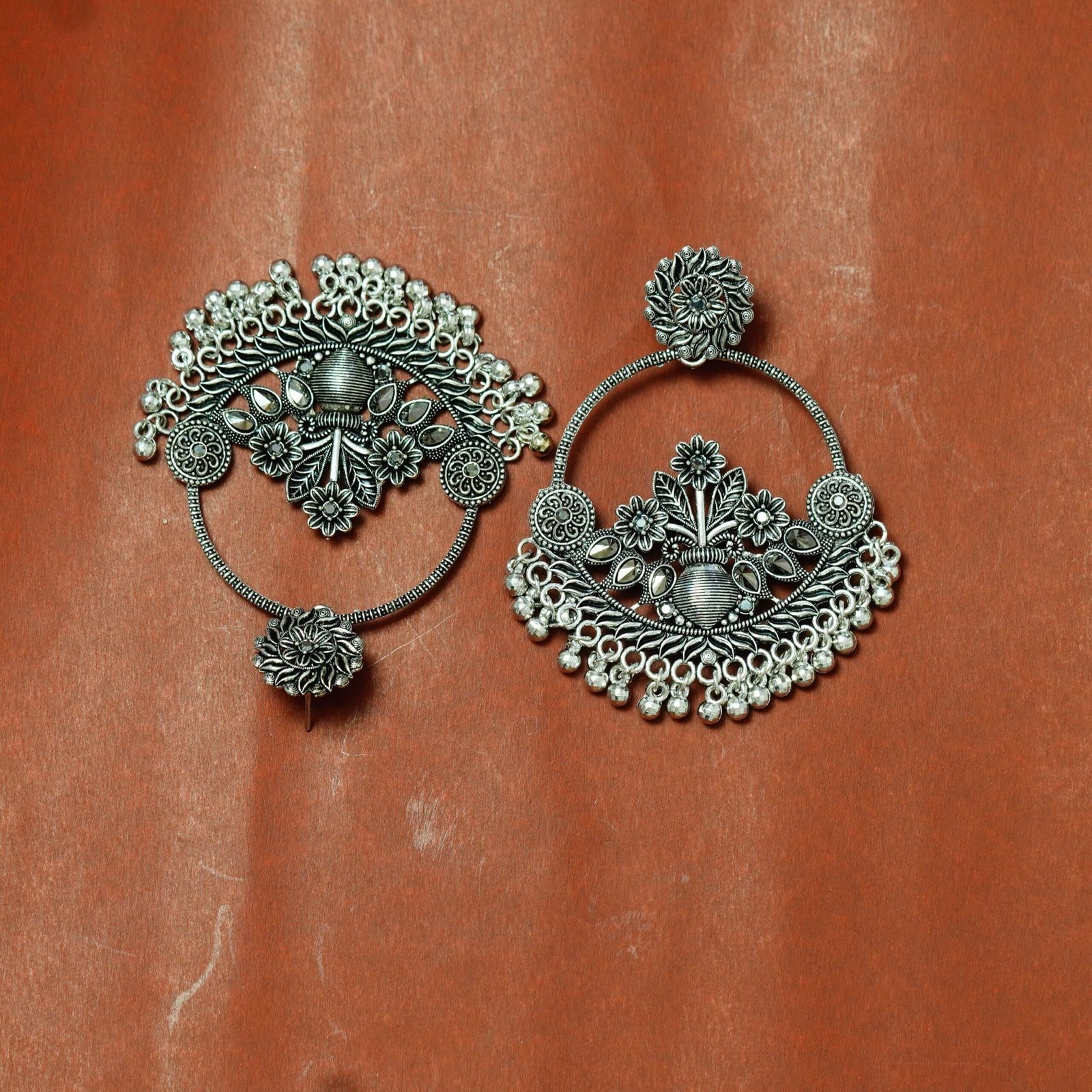 Adorn yourself with these stunning oxidized silver Chandbali earrings, featuring an exquisite traditional floral design. The intricate craftsmanship, combined with delicate ghungroo (tiny bells) dangling at the bottom, gives them a regal and timeless appeal. Perfect for pairing with ethnic wear like sarees, lehengas, or salwar suits for a classic, sophisticated look.