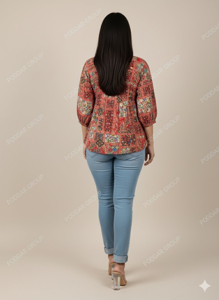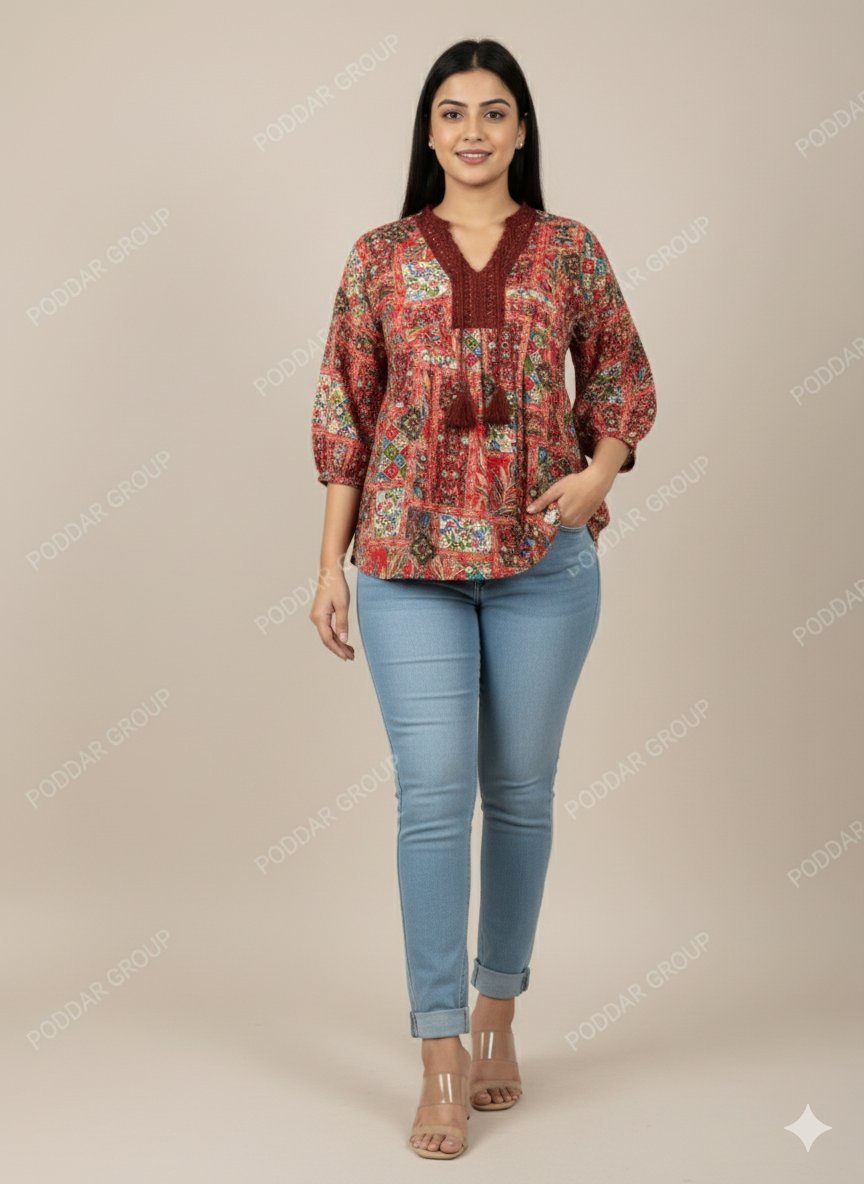 This eye-catching red tunic top features a vibrant patchwork-style print composed of intricate floral, ethnic, and geometric blocks in a rich palette of red, blue, green, and white. The top has a flattering design with a cinched empire waist that creates a comfortable, flowy silhouette. The neckline includes a V-cut accented with a detailed crochet lace yoke and decorative tassel ties. It features comfortable short sleeves (or half sleeves) with a slight flare. Made from a light fabric, this top is perfect for adding bold color and bohemian flair to your casual wardrobe.