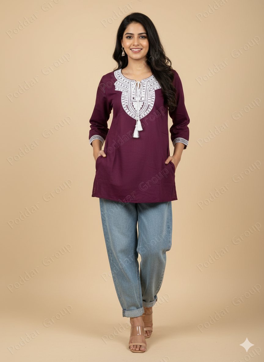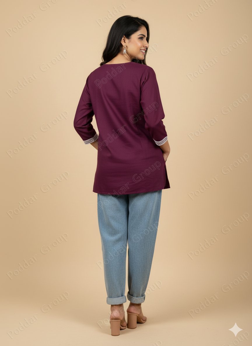 This elegant tunic features a rich, solid plum or deep purple color, making it a sophisticated and versatile piece for any wardrobe. The clean color is beautifully contrasted by intricate white detailing.